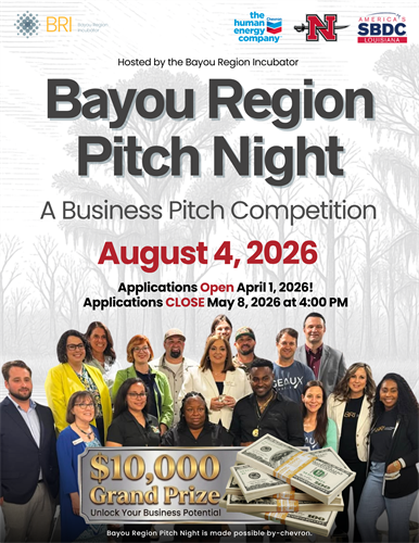 The Bayou Region Incubator, in partnership with Chevron, Nicholls State University, and the Louisiana SBDC, is proud to announce the 2026 Bayou Region Pitch Night!